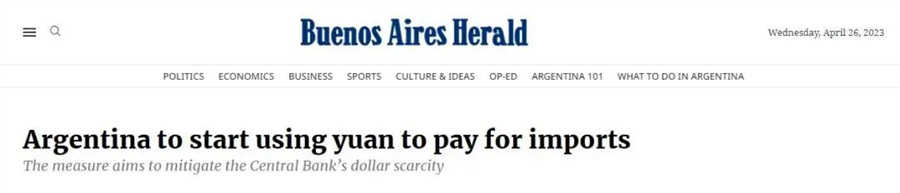 预计从5月份起,阿根廷还将使用人民币支付价值相当于7.9亿至10亿美元的中国进口商品。