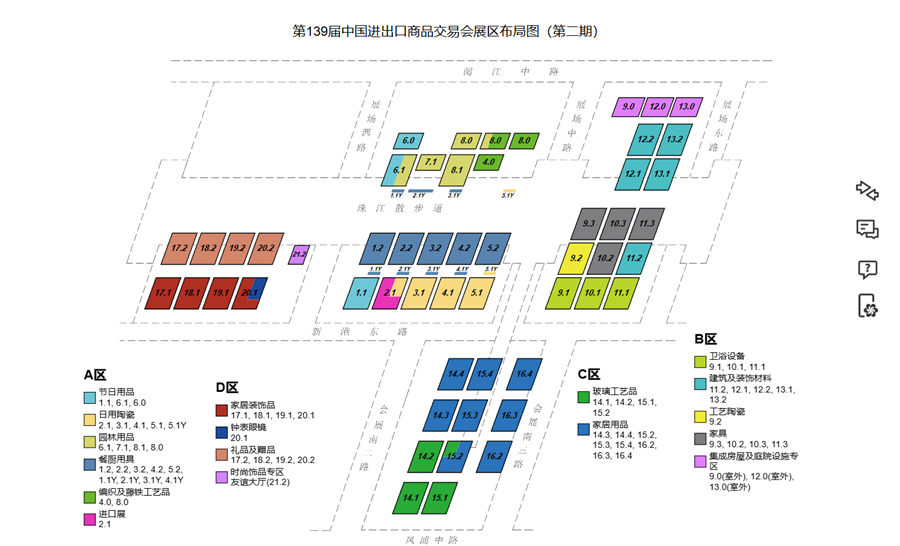 餐橱用具展区、家居装饰展区、编织及藤铁工艺品展区、家居日用展区、钟表眼镜展区、日用陶瓷展区、玻璃工艺品展区、园林产品展区、个人护理用品、礼品及赠品、工艺陶瓷展区、家具展区、铁石(户外)、浴室用品展区、玩具展区、宠物用品展区