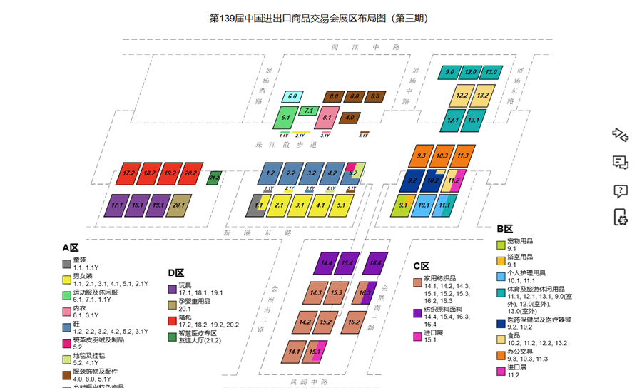 箱包展区、内衣展区、服装饰物与配件展区、、地毯及挂毯展区、医药保健品及医疗器械、鞋类展区、男女装展区、运动及休闲服展区、家用纺织品展区、食品展区、体育旅游休闲用品展区、进口展区、童装展区、裘皮展区、纺织原料面料展区、土特产品展区、办公文具展区展区