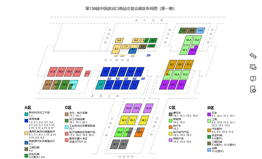 机械展区、汽车配件展区、户外车辆、电子电气展区建筑及装饰材料展区、新能源展区、自行车展区、化工展区、家电展区、计算机及通讯产品展区、卫浴设施展区、工具展区、摩托车展区、五金展区、电子消费品展区、灯具展区、进口展区